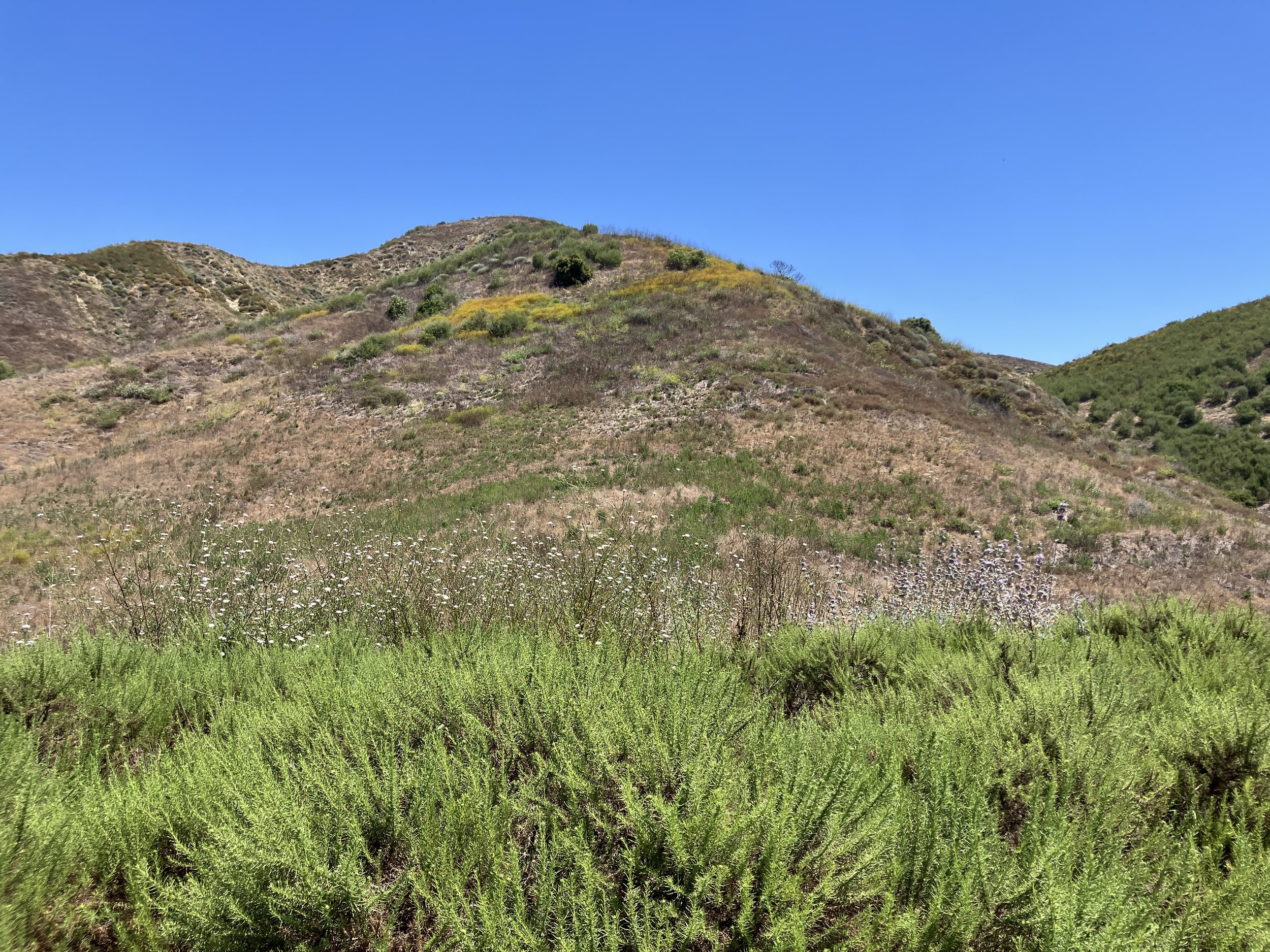 The trail picks back up; it heads to the right to the top of the hill where the Gratitude Bench sits; the 101 Freeway is a backdrop to the bench with the meadow stretched out in front